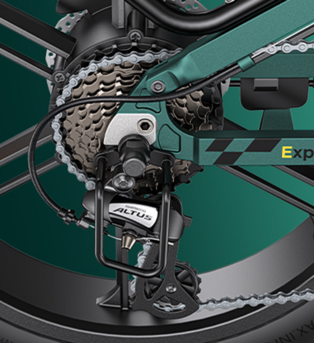 • Transmission: Utilizes a Shimano Altus 8-speed gear system, allowing for versatile riding across different terrains and inclines.