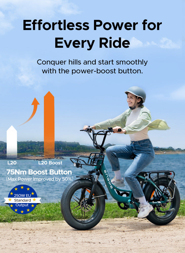 The ENGWE L20 Boost is a versatile step-through electric fat bike designed for both urban commuting and off-road adventures. Its low-step frame ensures easy mounting and dismounting, making it accessible to riders of various heights.