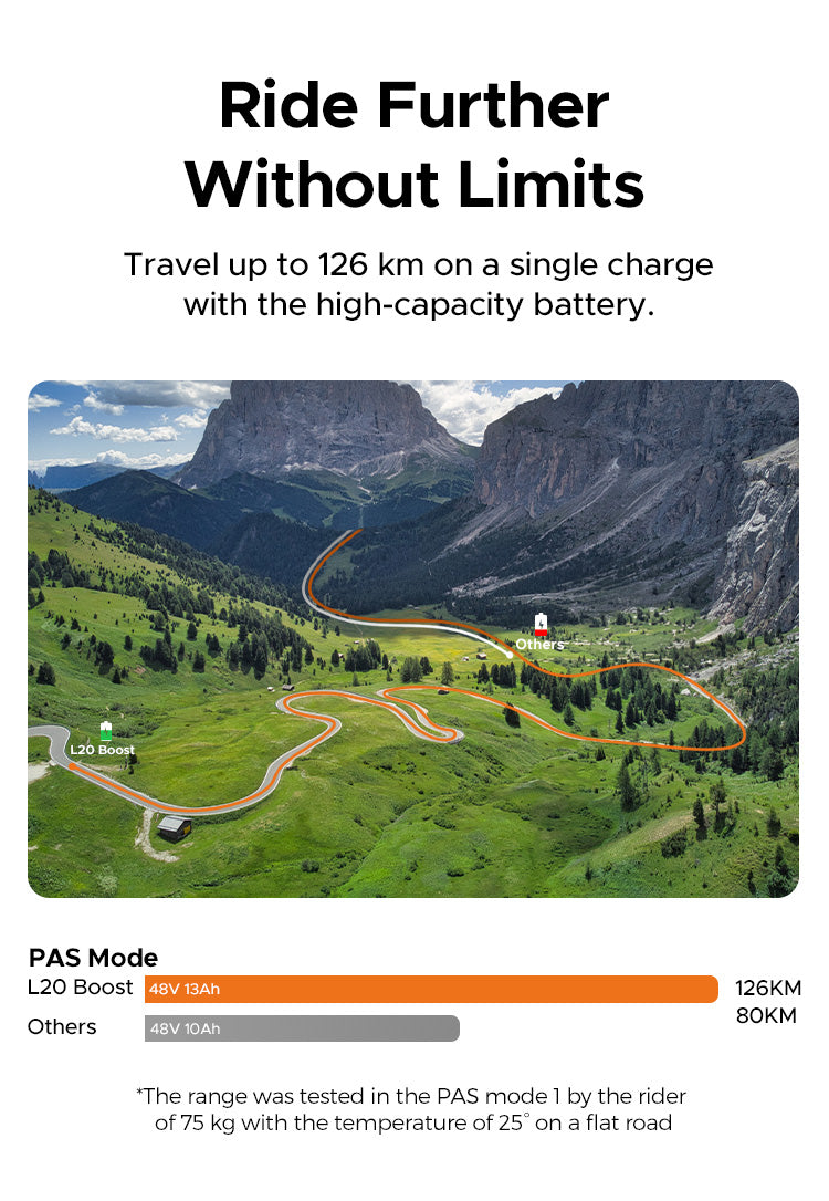 Motor & Battery: Equipped with a 250W brushless motor and a 48V 13Ah lithium-ion battery, the L20 delivers a top speed of 25 km/h and a range of up to 140 km on a single charge, depending on riding conditions and assistance level.