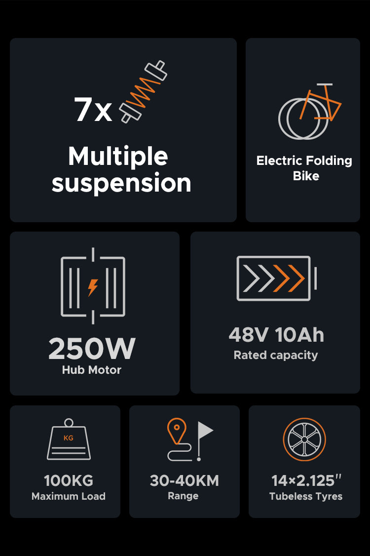 • Motor & Battery: Equipped with a 250W hub motor and a 48V 10Ah lithium-ion battery, the T14 offers a top speed of 25 km/h and a range of up to 42 km in pedal-assist mode.